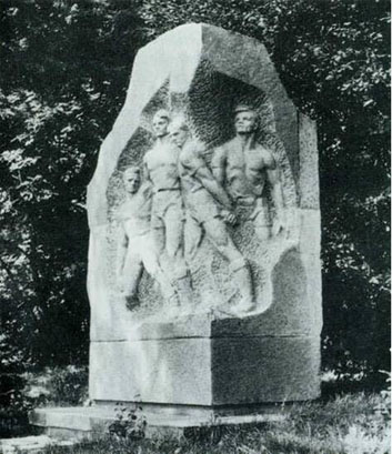 A Problem: two images of supposed monuments to FC Start players. The left hand image is outside the Dynamo Kiev Stadium and comes from a private US Ukrainian websiteset up by Andrew Gregorovitch. It appears to show four muscular athletes (footballers?) in heroic poses.