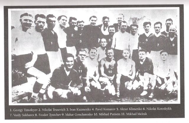 The book gives a very detailed account of the Game of Death. The origins of this newspaper photo are not clear but we do know that Dougan hired a local from Kiev to look through the archives and the newspaper records of that time. The photo was taken after the game with PGS (white shirts) on July 17th. Players featured include Kuzmenko (back row far left). Goncharenko, the tricky winger is far right, middle row, with receding hairline. Trusevitch is on the original photo but off this cropped picture, standing well to the left and grinning. In post-war Soviet Ukraine, a photo of Ukrainian players standing alongside German players would have been enough to send the surviving Ukrainians off to Siberia for collaboration with the Fascist enemy.